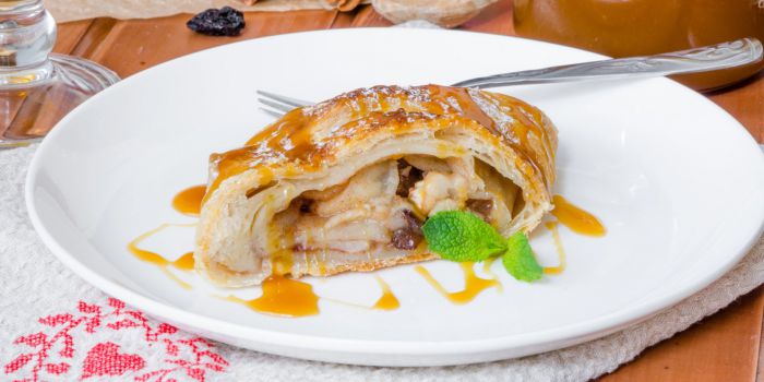 Це відомий австрійський десерт з тонкого тіста та соковитої фруктової начинки. Готуємо просте тісто на розпушувачі й додаємо яблука з горіхами та кори...