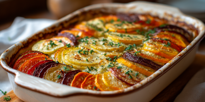 Овочевий гратен — це яскрава запіканка з трьох видів овочів, запечених у вершковому соусі з пармезаном. Тонкі скибочки картоплі, батату й буряка викла...