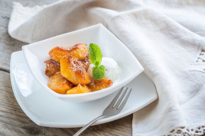 Персики, мариновані в коньяку зі стручками ванілі та цукром, — незвична начинка для млинців чи морозива. Вони також чудово смакуватимуть просто з ложк...