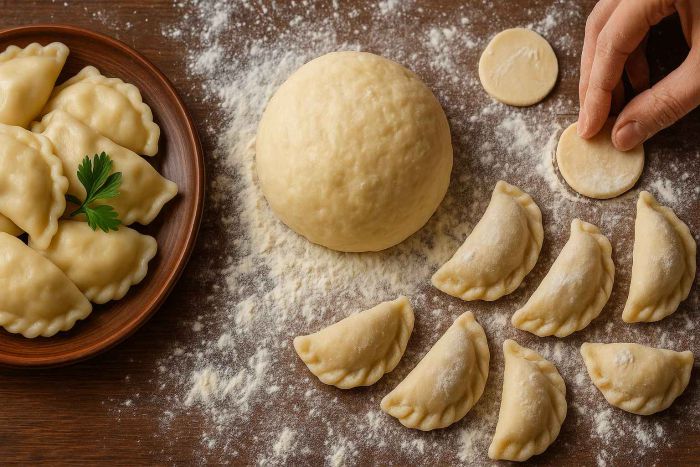 Це універсальний рецепт тіста на кефірі для солоних і солодких вареників. До тіста на вареники додамо теплий кефір або кисле молоко і харчову соду. Пі...