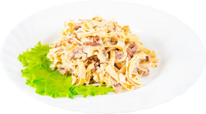 Інгредієнти для салату "Міністерський" прості й доступні, але рецепт досить оригінальний, тому цей м'ясний салат цілком може замінити олів'є на святко...