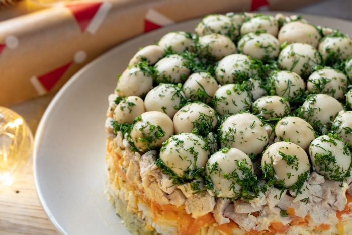 Салат грибна поляна — це яскрава страва, де мариновані печериці утворюють ефектну верхівку, а під ними — соковиті шари з картоплі, курки, яєць і сиру....